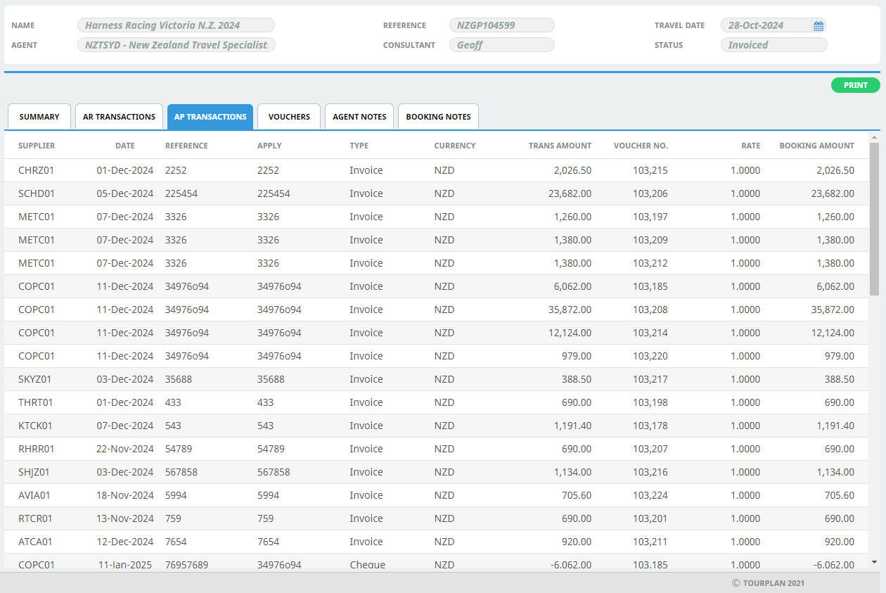 Clicking the AP Transactions Tab will display all of the current AP (Creditors) Transactions for the booking.