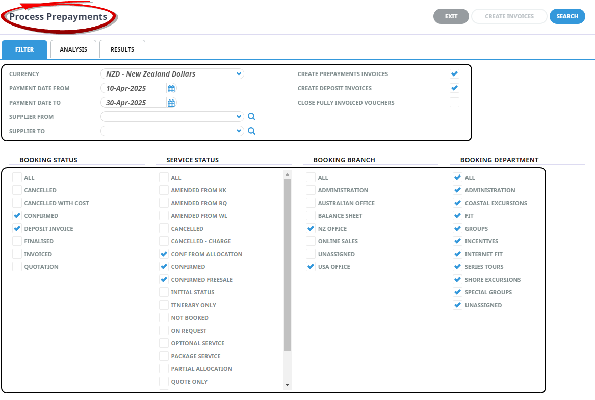 - Keeping with Process Prepayment Filter Tab select by All, or specific Booking Statuses, Service Statuses, Booking Branches and Booking Departments.