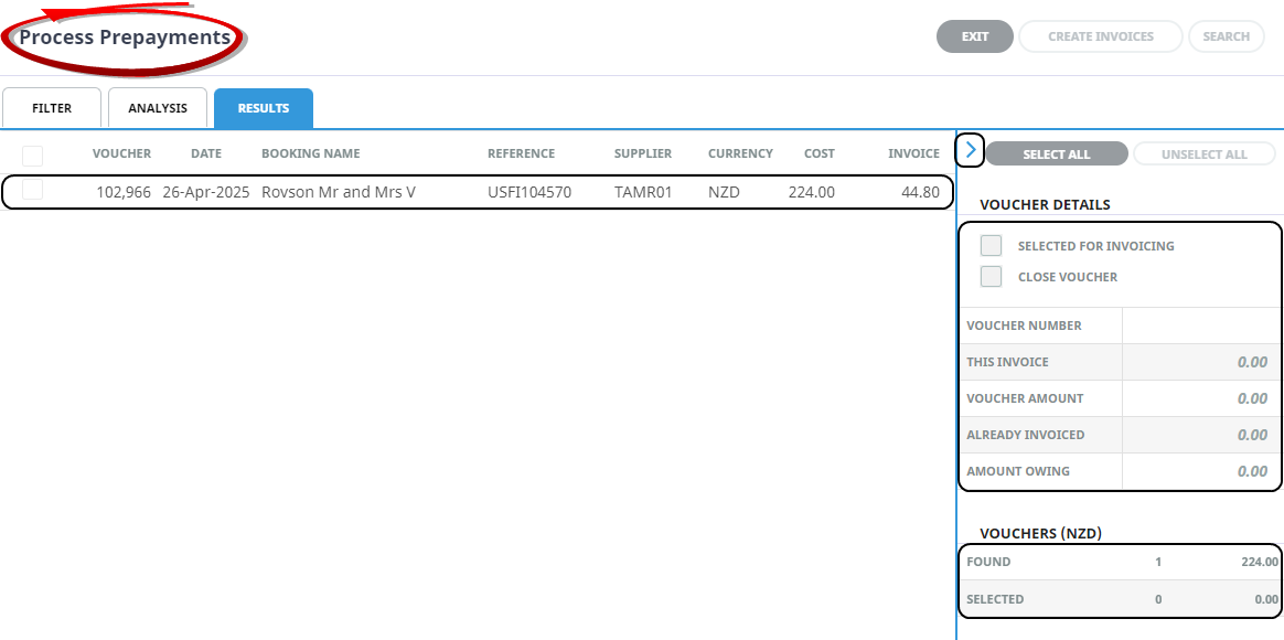 NOTE: Only those booking services that a) meet the selection criteria entered in the Creditor Pre-payments screen and b) have a service status that permits accounting transactions to be entered against the line. And c) the booking status allows accounting transactions, will be selected.
