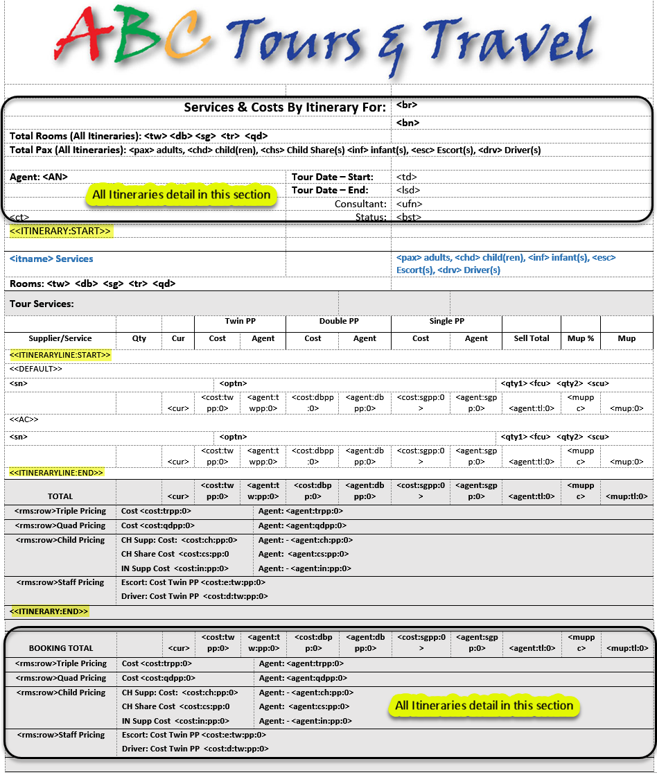 The Itinerary Section allows details of pax, services and costs etc to be output per Groups Itinerary.