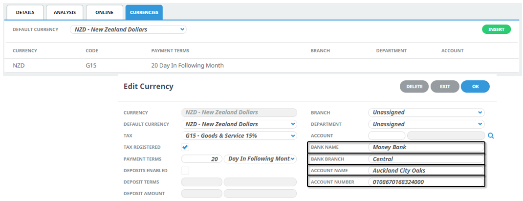 When a currency is selected the Edit Currency Screen will display, this is where the Bank Name, Branch, Account Name and Account Number comes from per currency.