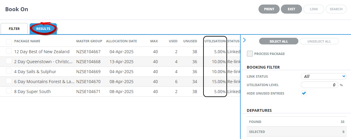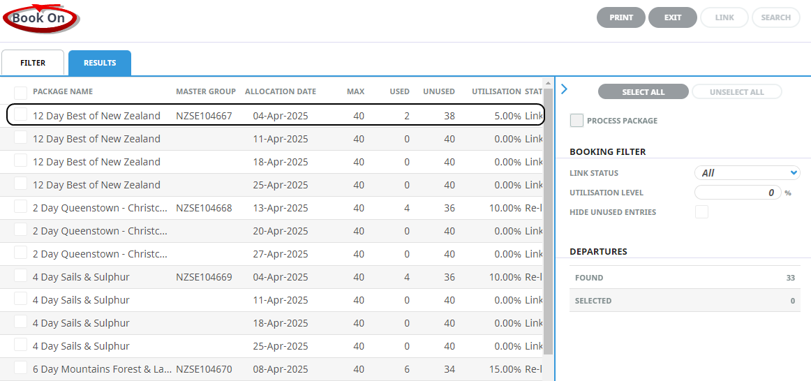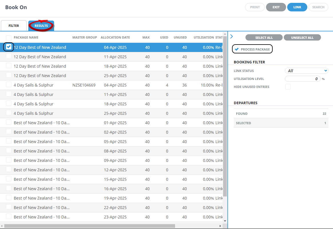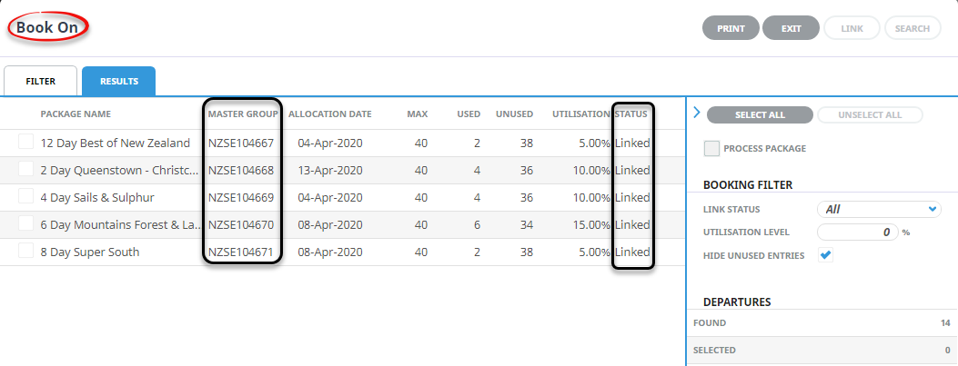 Book On Results screen will re-display, the package will have updated the status to 'Linked' select 'Exit' to close.