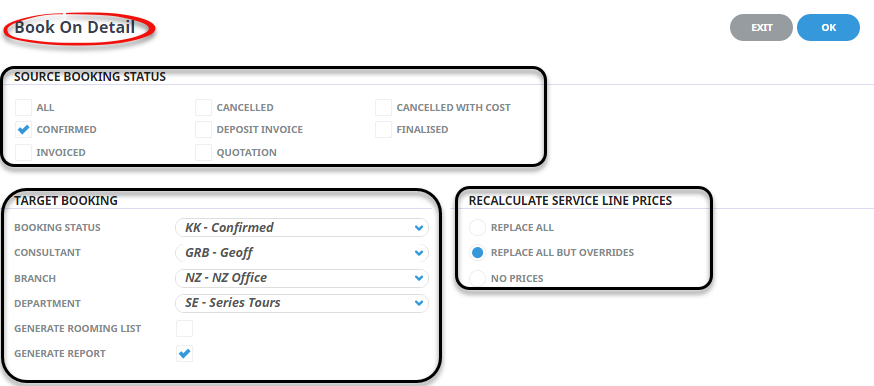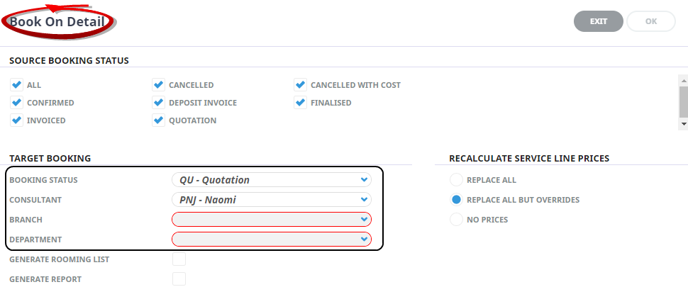 Book On Detail screen, select the (FIT) Source Booking Statuses, and the (New Group Booking) Booking Status, Consultant,Branch and Department.
