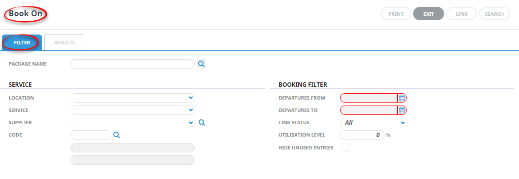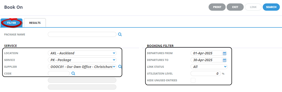Book On screen, the Filter Tab will open. Select either the (PCM) Package Name or the (Product Package) Service Location, Service, Supplier, and enter the Service Code. Under the Booking Filter heading, select the required Departures From and To dates.