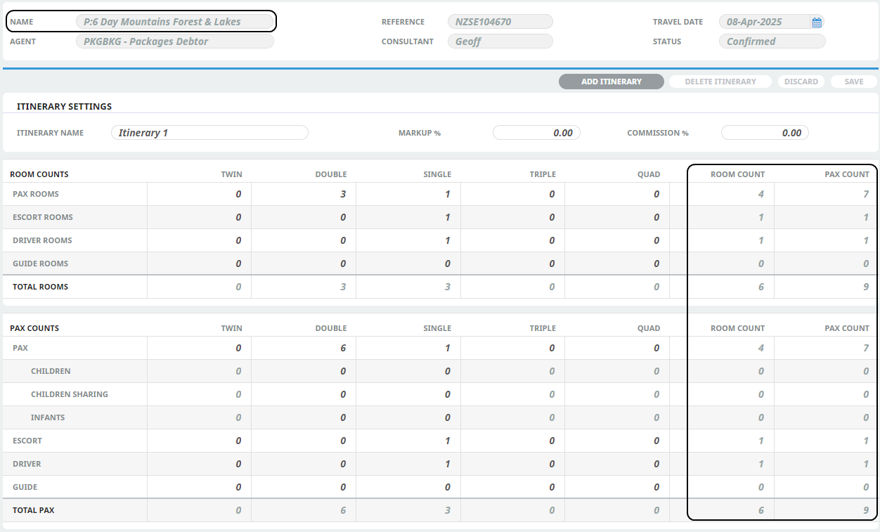 - The quantity of pax from all of the FIT booking headers will have been entered in the Pax Configuration screen, based on the room types used in the FIT bookings