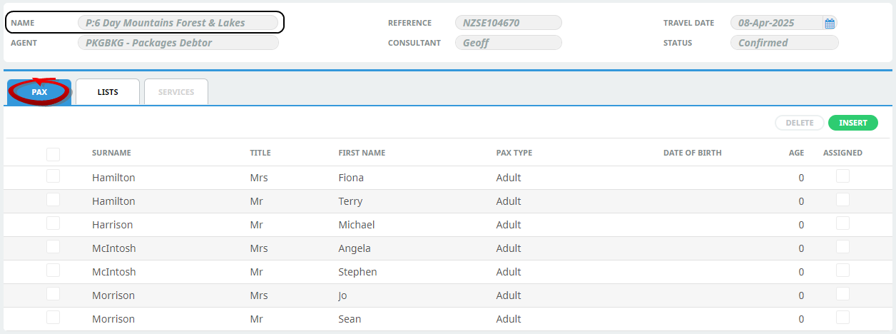 - The pax names from the FIT Bookings Pax Travelling screen ‘Pax’ Names will be in either the Group Rooming List/Pax Names screen, or be able to be output on the nominated Rooming List note category.