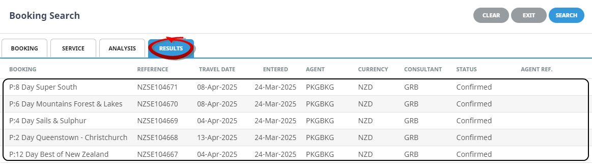 NOTE: The results tab will not return bookings until either the (PCM) Package Name or the (Product) Service fields are valid, and the Departure From and To fields have dates applied.