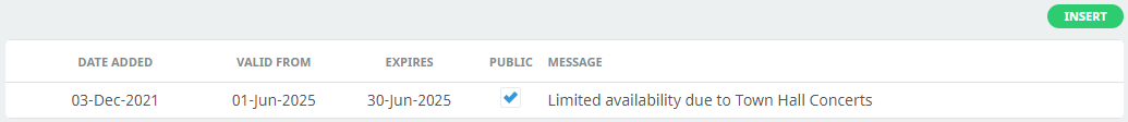The example below shows the text Limited Availability due to townhall concerts and will show when consultants book/quote rooms for this supplier between 01 June 2025 and 30 June 2025, the message will be available to agents online through webConnect.