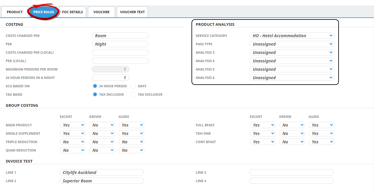 This example from the Product application shows the Analysis Code labelled "Service Category" is HO - Hotel Accommodation, since the property is a hotel.