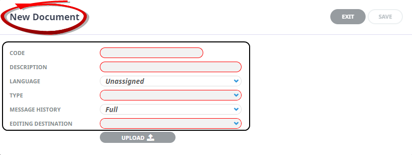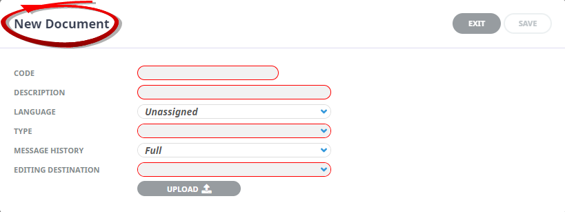 New Document screen, enter a Code and Description. Select a Language, Type, History and Editing Destination.