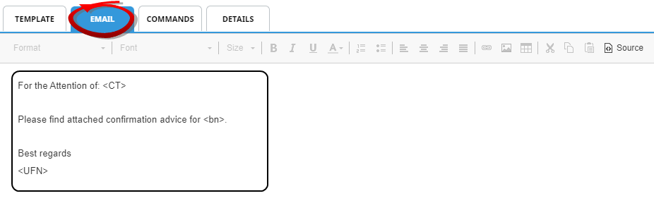 This tab will remain hidden unless the Word document has had an email container inserted and saved. The contents of the email tab are dependent on the text and substitution codes included within the tags <EMAIL_CONTAINER_START> and <EMAIL_CONTAINER_END>. For more information on email commands click Email Commands.