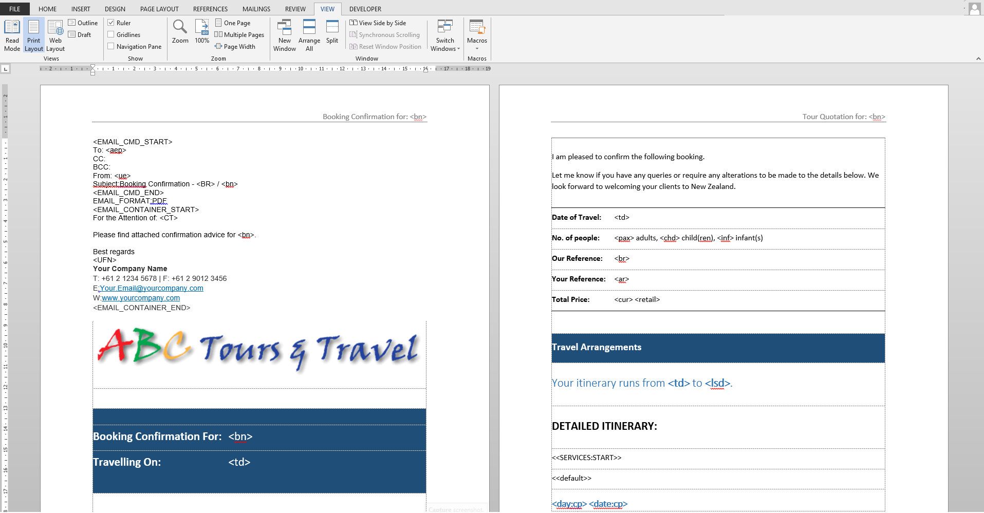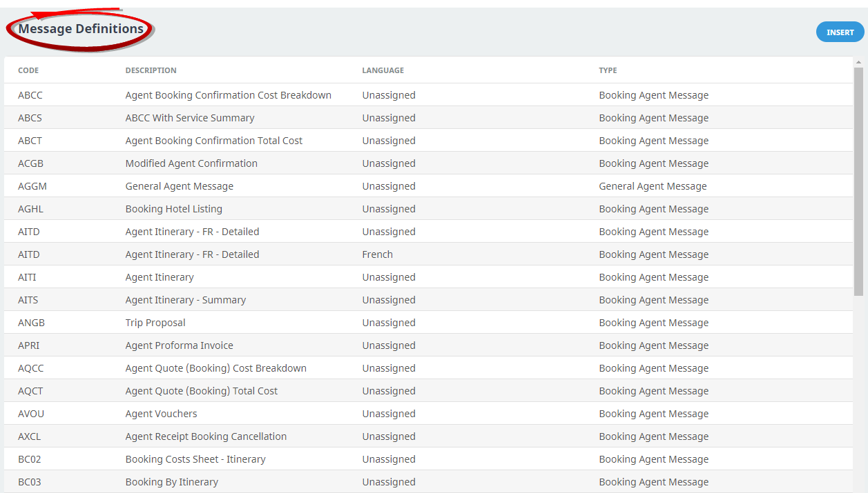 | Booking Agent Message | Used for all templates where the booking agent is to be the message recipient - e.g., booking confirmations, itineraries, proposals, internal costing sheets etc. |