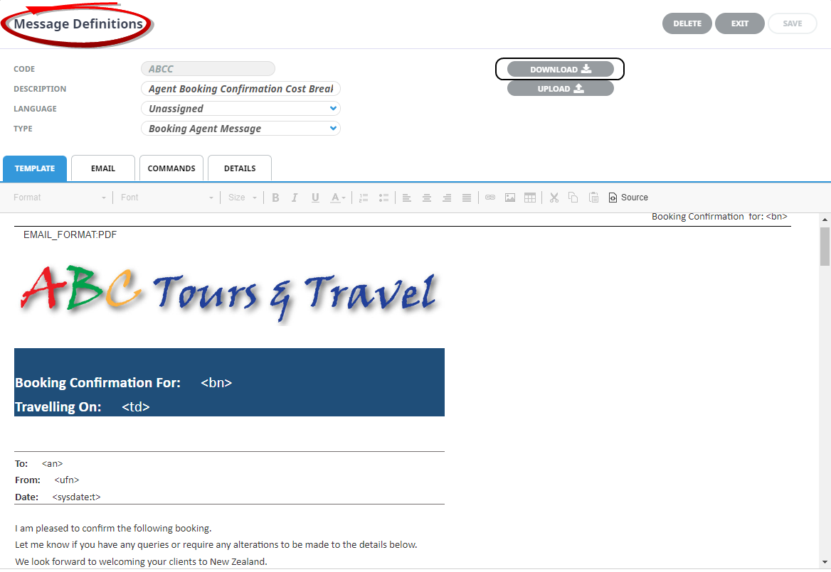 Message templates are stored in Message Definitions and are initially created as Word documents and then uploaded and stored in the Tourplan NX database. New Tourplan NX systems come pre-populated with some example messages.