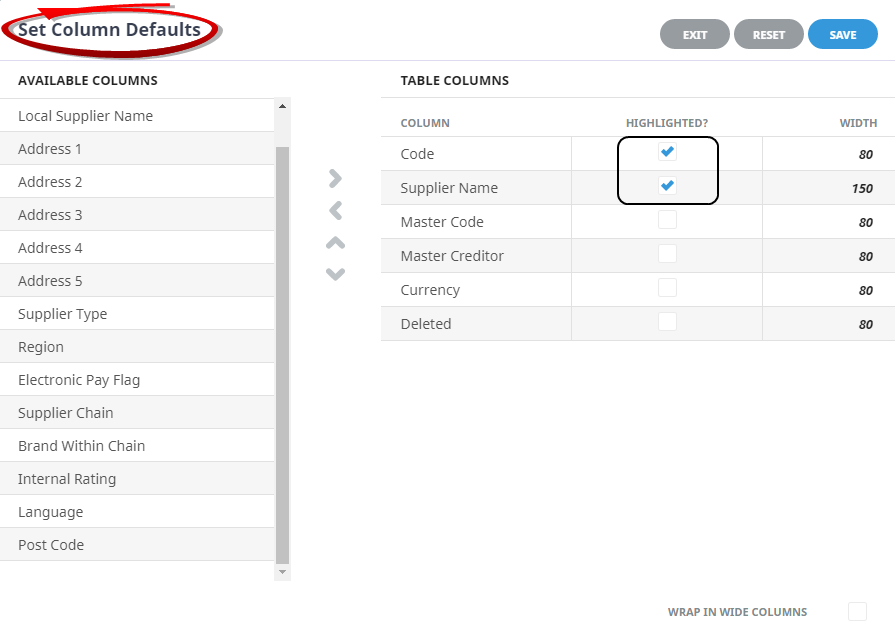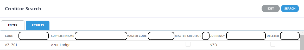 For example, click the white space between column headings Code and Supplier Name or Supplier Name and Master Code, (or between any of the column headings) in the search screen: