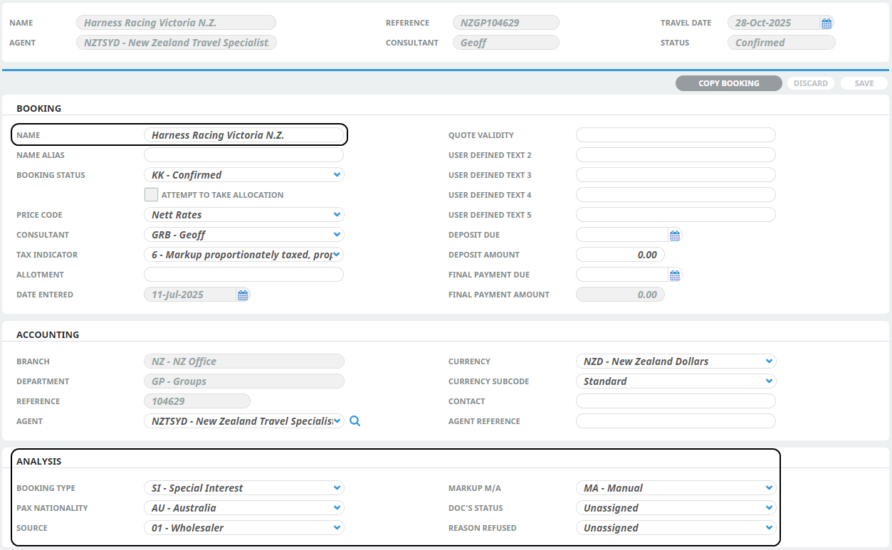 This example shows changes made to the booking Name (edited to be Harness Racing Victoria N.Z.) and three of the six analysis codes:
