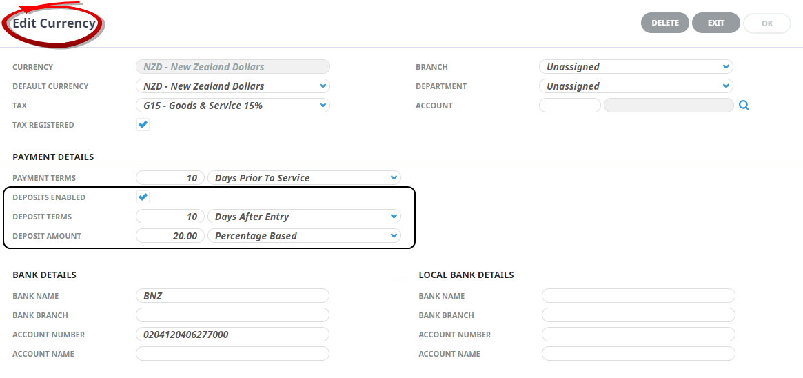 A deposit is a partial payment amount that is made in advance of the service being used and is controlled by the Deposit Terms check-box in the supplier currencies screen, the terms of the deposit, and the type of deposit (percentage or amount).