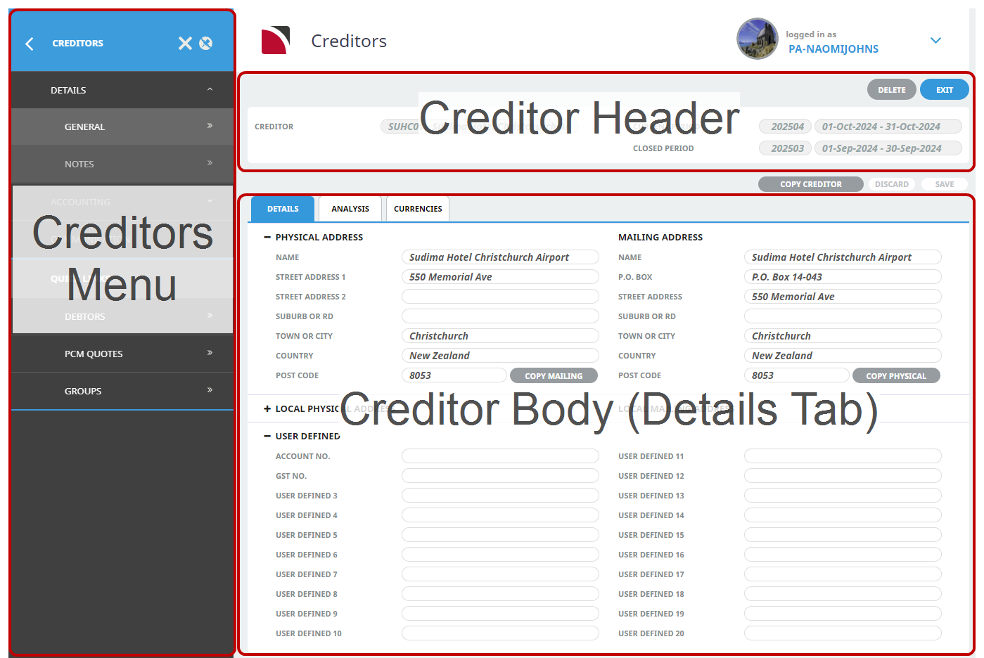 Creditors are created in the Creditor application. The following screenshot is an example of the Creditor screen with an existing Creditor selected: