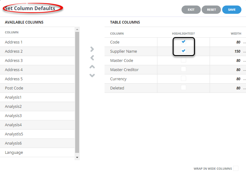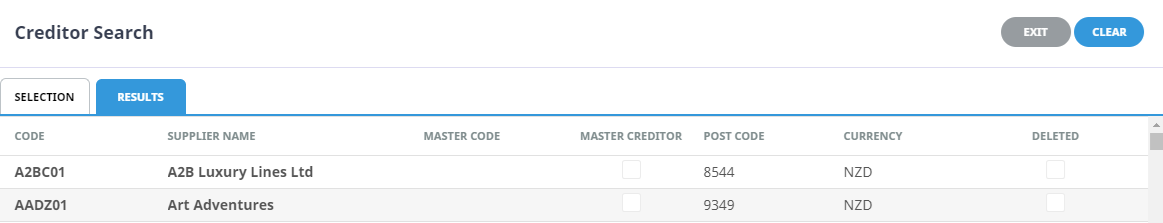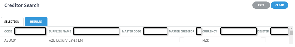 For example, click the white space between column headings Code and Supplier Name or Supplier Name and Master Code, (or between any of the column headings) in the search screen: