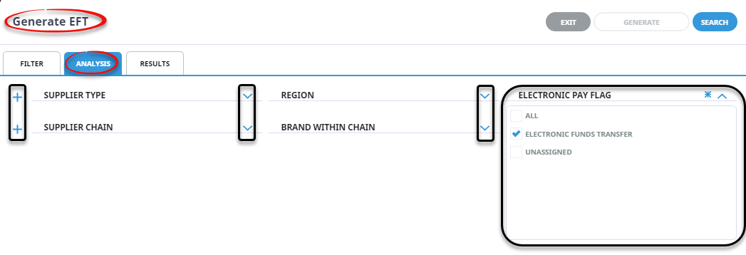 - On the Generate EFT Filter Tab screen, enter the required filters to set the search criteria, selections can be filtered by: