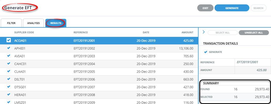 Or, Select the transactions to include in the EFT payment by clicking the required