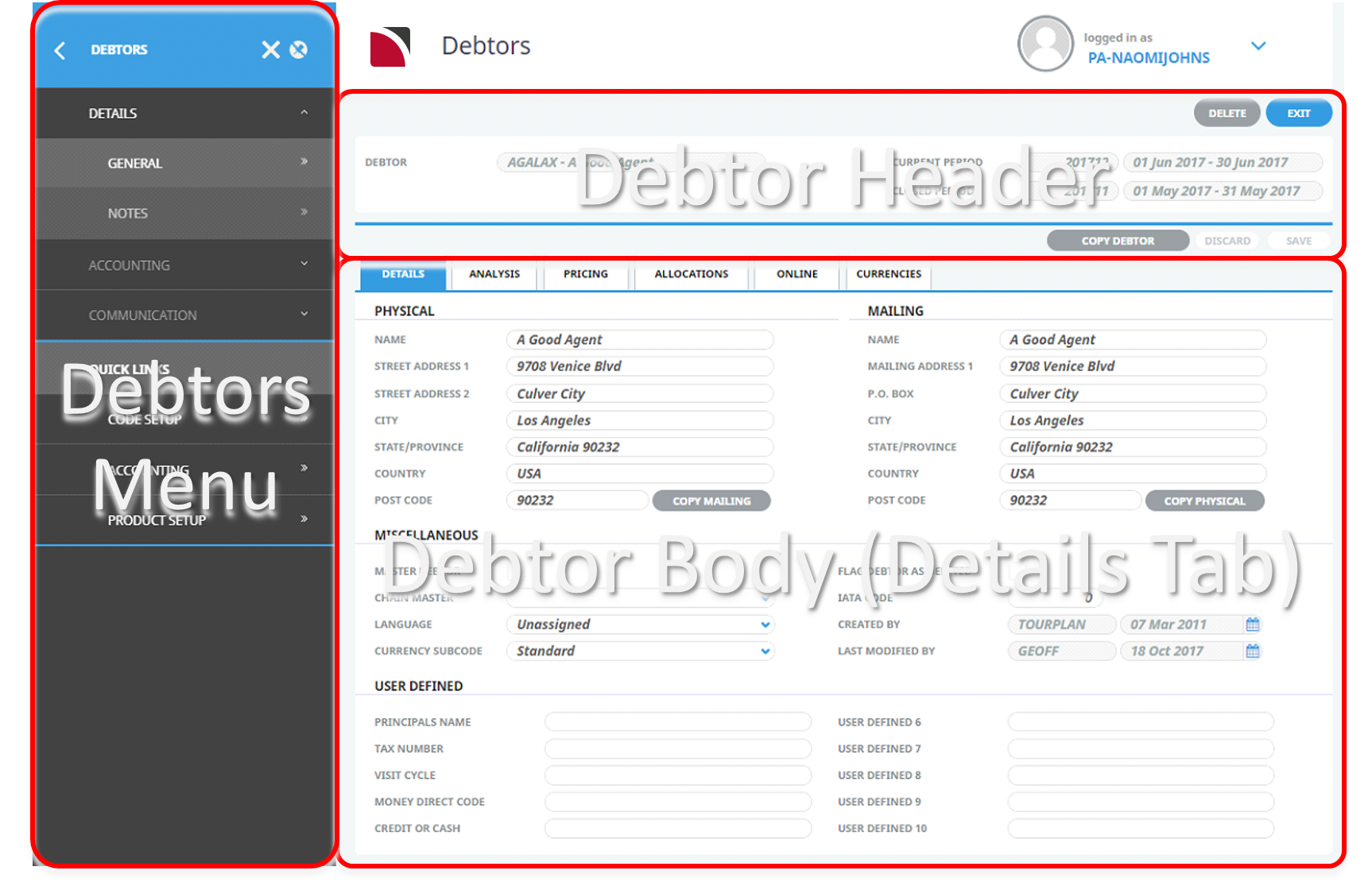 The Debtors application is where debtor accounts are created and managed, and sundry debtor transactions - non bookings invoices, cash receipting, credit notes etc. - can be entered. A Debtor is a person or company that owes money to the Tourplan User Company. Debtors can be Agents, Wholesalers etc., but may well be individuals.