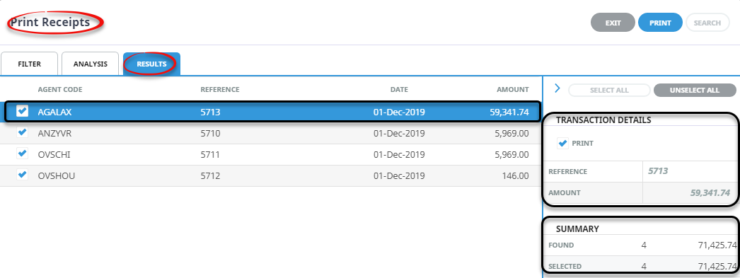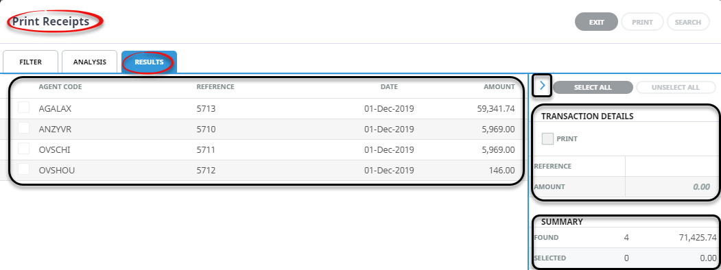 The screen is in three sections. Any receipt transactions which match the filter criteria display in rows on the left of the screen and show the Agent Code, Receipt Reference, Transaction Date and the Amount.