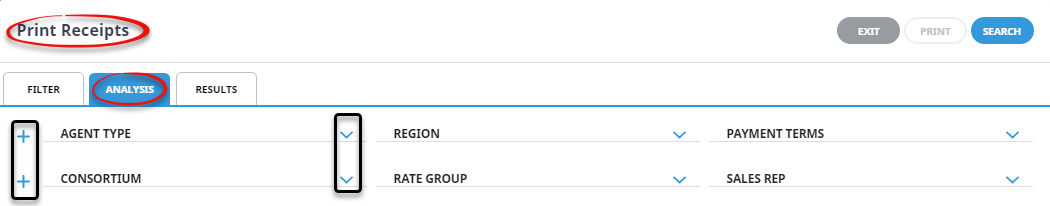 Select the Analysis Tab, and if required filter by the 6 Analysis Codes attached to Agents. When the Analysis Tab is accessed, the available selections are in collapsed mode. Click the