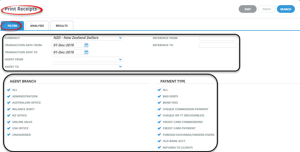 - Within the Print Receipts Filter Tab screen, select by All, or specific Agent Branch and/or Payment Type. NOTE: This is the Branch and Payment Type of the Agent, not the Booking.