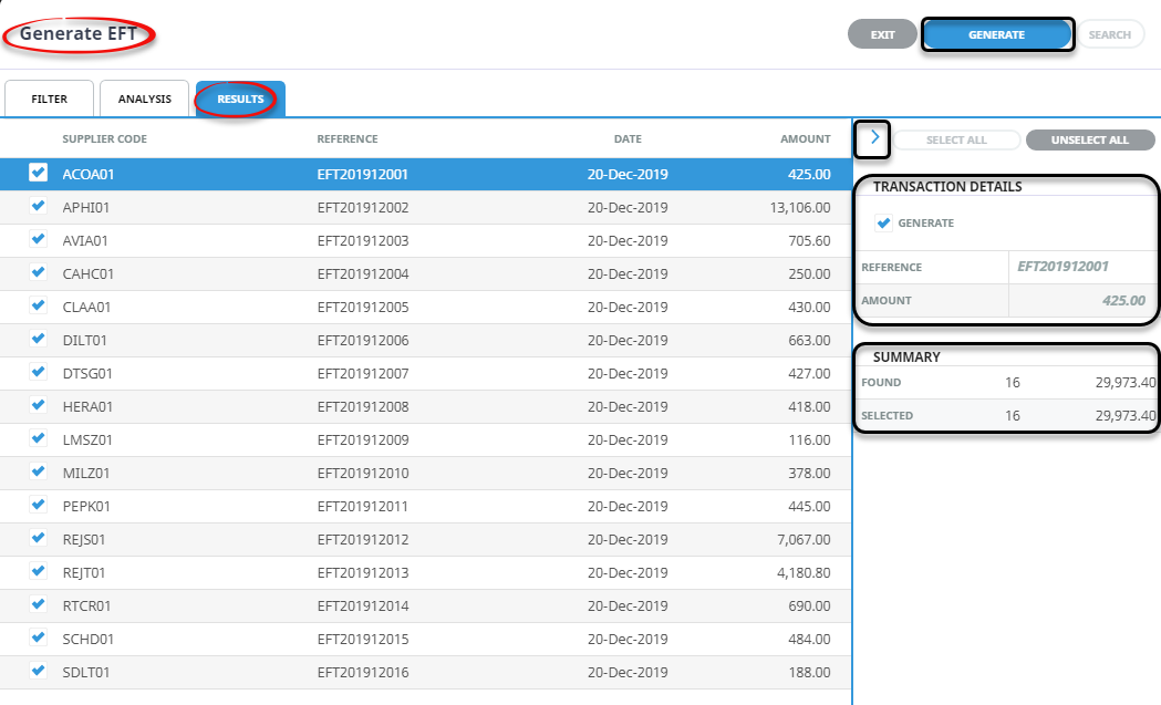 Any payment transactions which match the filter criteria display in rows on the left of the screen and have a selection check-box first and then show the Supplier Code, Payment Transaction Reference, Transaction Date and the Payment Amount.