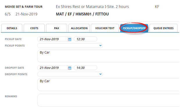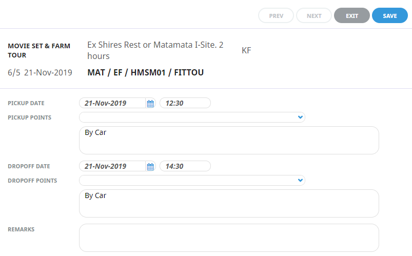 The Pickup / Dropoff screen allows viewing and editing of the pickup and dropoff times and places, as well as a remarks field for each service in a booking.