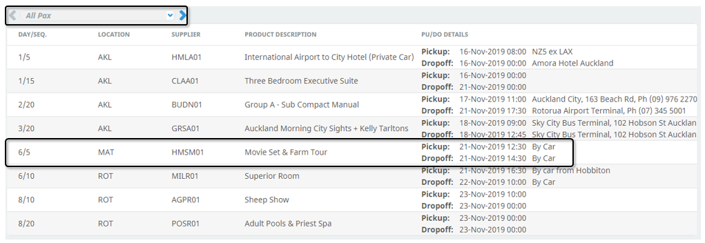 • It is easier if all services are entered into a booking before adding or editing the Pickup/Dropoff details, since, as services are included in the booking, the supplier name is added to a list of ‘available’ pickup or drop-off points. Most pickup and drop-off points can be selected from a drop-down without having to type the names. Any details that are manually entered are also stored and are available from the drop-down list. Data selected from the drop-down list can be edited.