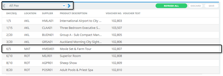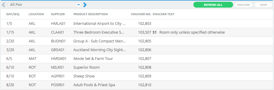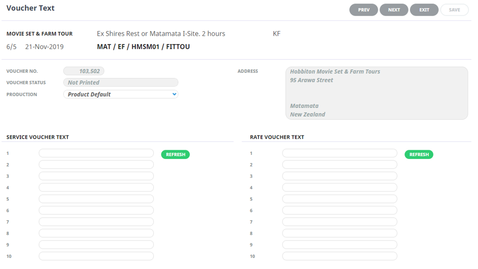 The Voucher Text screen allows viewing and editing of the voucher text fields. The voucher text for all services in the booking is displayed.