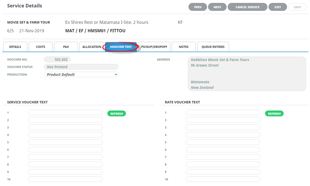 Voucher number 102804 below has one line of voucher text at Line 1 of the Service Voucher Text and 0 lines of the Rate Voucher Text. This means there can be voucher text which relates to the service in general, but nothing that applies specifically to a rate, rate period or price code; e.g. information relating to a special promotion taking place for a limited period.
