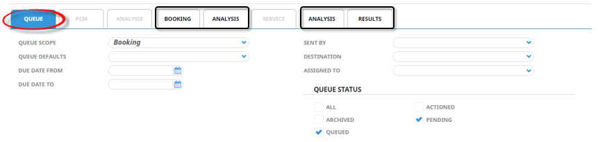 For example: Selecting a Queue Scope of Booking, will allow selections within the Booking and the Analysis Tab.