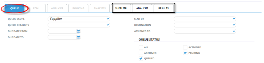 Where as selecting a Queue Scope of Supplier, will allow selections within the Supplier and the (Supplier) Analysis Tab.