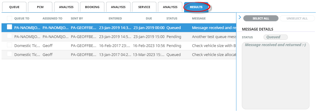 Results Tab to display a list of Queue Messages using the Queue Description.