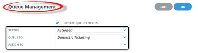 Update Queue Entries. The status of the queues can be marked as; actioned, archived, pending or queued. NOTE: A Queued Destination can be assigned to the queue to field or the queue can be assigned to a colleague.