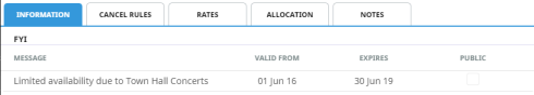 The message will display in bookings provided the Service Date falls between the Valid From and Expires dates. If there are multiple messages for the same period, they are able to be scrolled through. FYI messages are visible from the Information Tab at the time of booking the product.