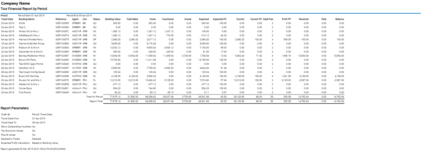 The Tour Financial Summary (TFS) reports key financial parameters, one line per booking, for a variety of purposes, but particularly detection of problems with tours or groups of tours (e.g., by department by consultant etc.) in the areas of: