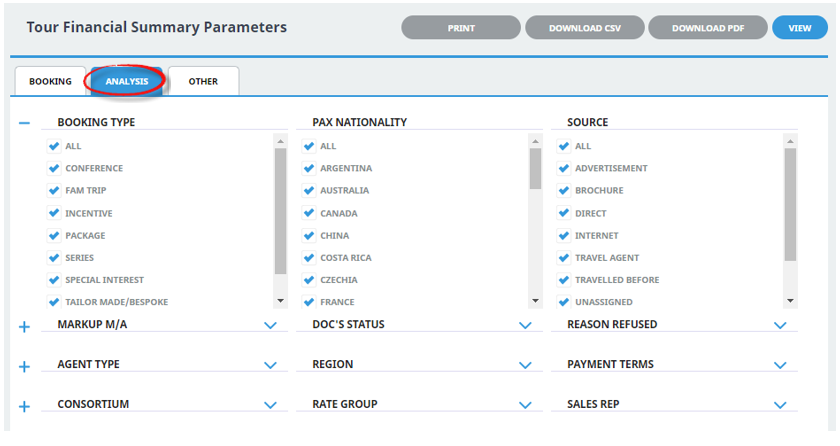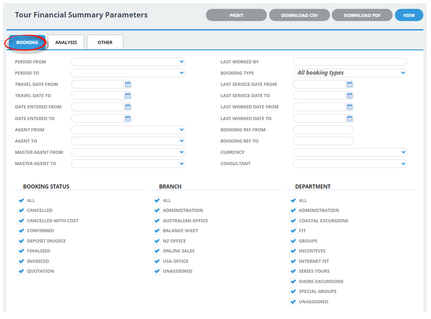 On the blank Tour Financial Summary Parameters screen, the Booking Tab will open, select the required parameters for the Tour Financial Summary Report.