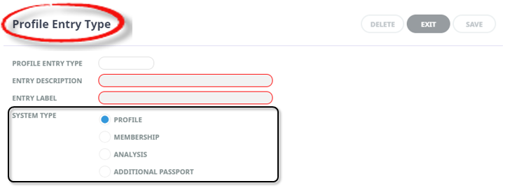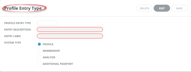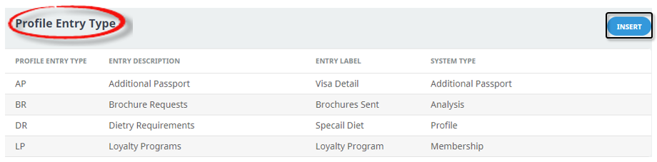 NOTE: Profile Entry Types are the highest level of data and are basically headings for lower level data to be inserted.