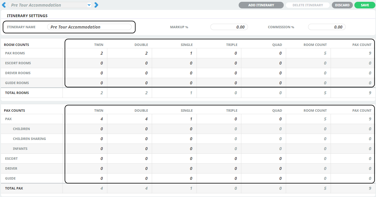 new itinerary on the Pax Configurations screen, enter pax configuration details as required in the Itinerary Settings, Room Counts and Pax Counts sections.