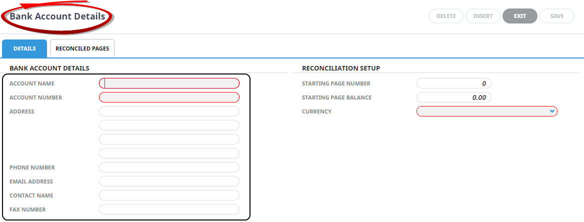 When a new or additional physical bank account is created, information is displayed across two tabs; the Details tab and the Reconciled Pages tab. This screenshot