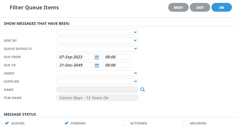 Date and time selections to narrow the date time frame of when the queue was sent.