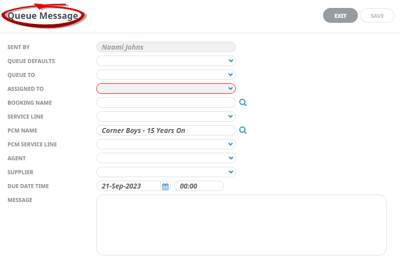 Booking name, if you have a booking that this message relates to selection can occur - otherwise leave the field blank