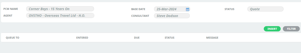Name of PCM if queue relates to a PCM. If you have the PCM open and have used the PCM Quotes menu selection to select Queue Entries the PCM Name will automatically display in this field.