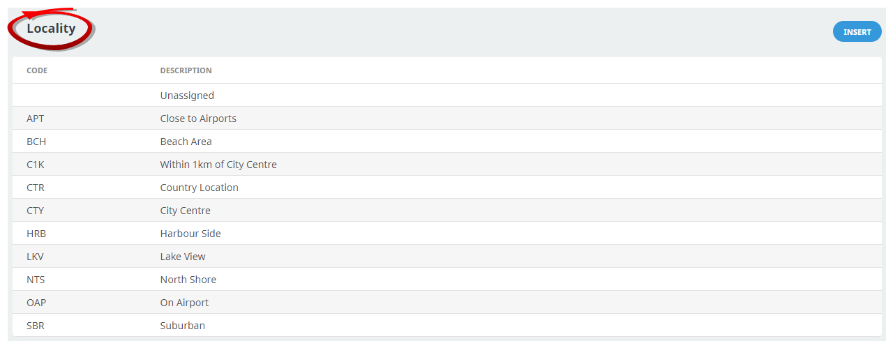 Localities can be used in Tourplan to split locations into specific areas. In the example procedure the locality has been used to split locations into generic areas such as APT- Close to the Airport, BCH - Beach Area or CTY - City Centre. Localities can be used to identify specific areas of a location; for example if the location is Sydney, the localities could be BON - Bondi Beach, ROK - The Rocks, or MAN - Manley.